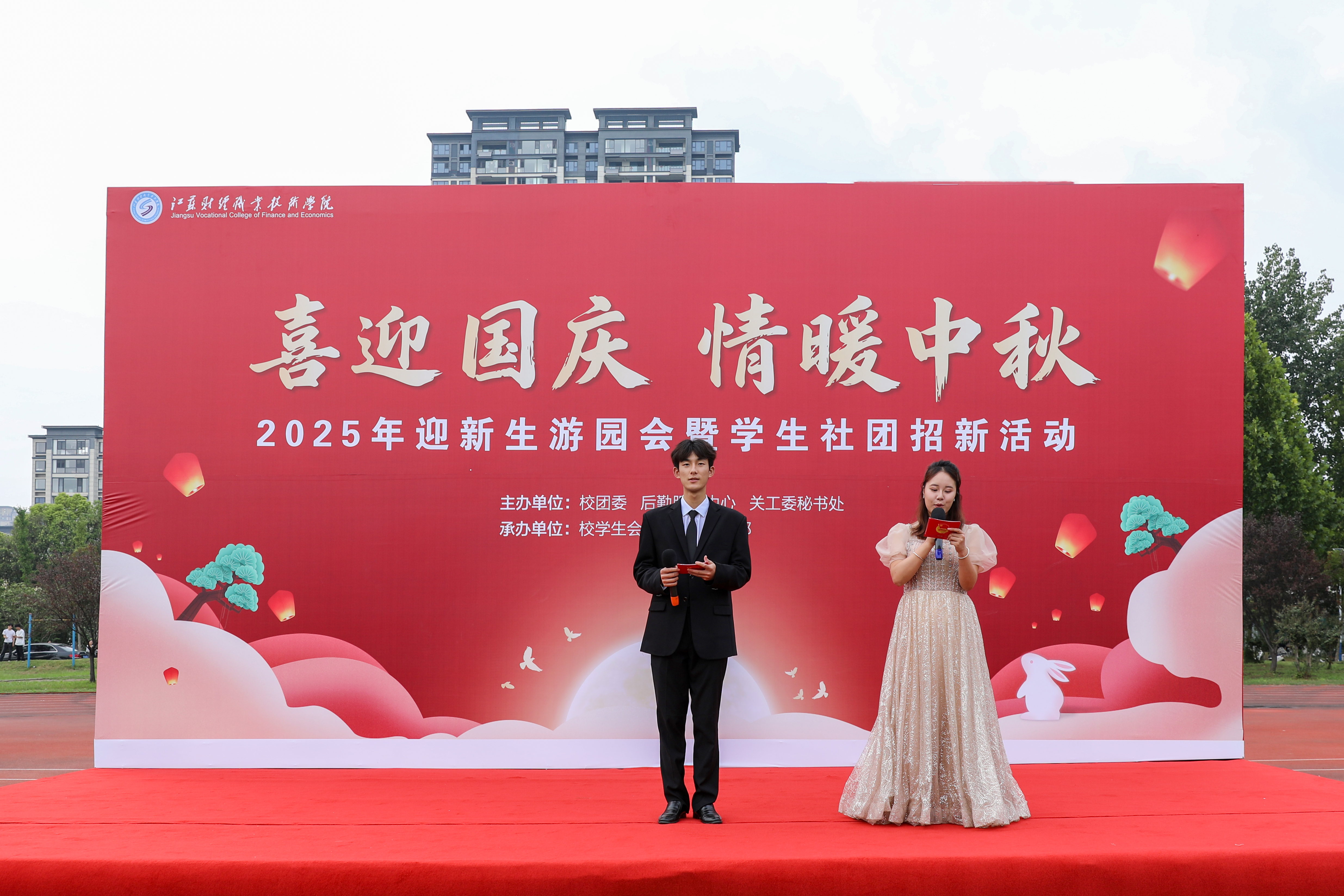 金秋送爽丹桂香,双节同庆情意浓,9月29日,由江苏财经职业技术学院团委、后勤服务中心、校关工委秘书处共同举办的“喜迎国庆 情暖中秋”2025年迎新生游园会暨学生社团招新活动在学校西操场顺利举行,活动以践行社会主义核心价值观为主题,旨在弘扬中华优秀传统文化,营造浓厚的校园文化氛围。学校党委书记闫超栋,党委委员、副校长梁枫,关工委常务副主任张春及关工委秘书处驻会老同志们深入现场指导,并与学生社团成员们进行亲切交流。