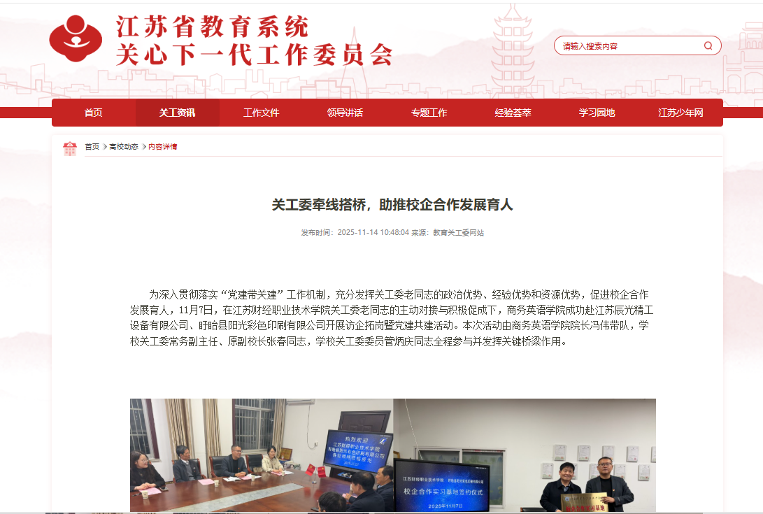 为深入贯彻落实“党建带关建”工作机制,充分发挥关工委老同志的政治优势、经验优势和资源优势,促进校企合作发展育人。2025年11月7日,在学校关工委老同志的主动对接与积极促成下,商务英语学院成功赴江苏辰光精工设备有限公司、盱眙县阳光彩色印刷有限公司开展访企拓岗暨党建共建活动。本次活动由商务英语学院院长冯伟带队,学校关工委常务副主任、原副校长张春同志,学校关工委委员管炳庆同志全程参与并发挥关键桥梁作用。